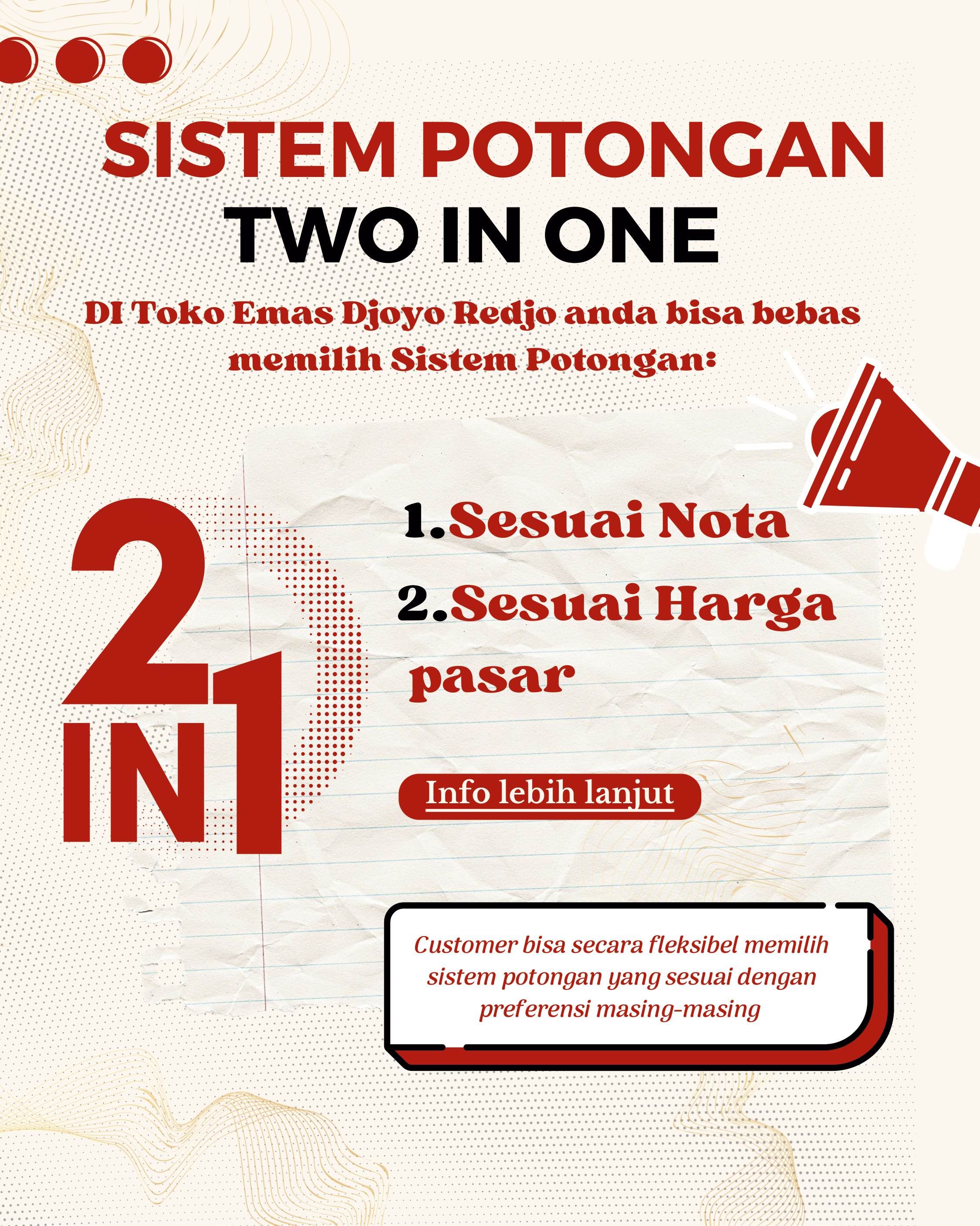 Potongan harga fleksibel, anda bisa memilih ingin potongan sesuai nota ataupun sesuai harga pasar (fluktuatif), informasi mengenai potongan bisa anda klik (link page produk bagian program 2 in 1) |